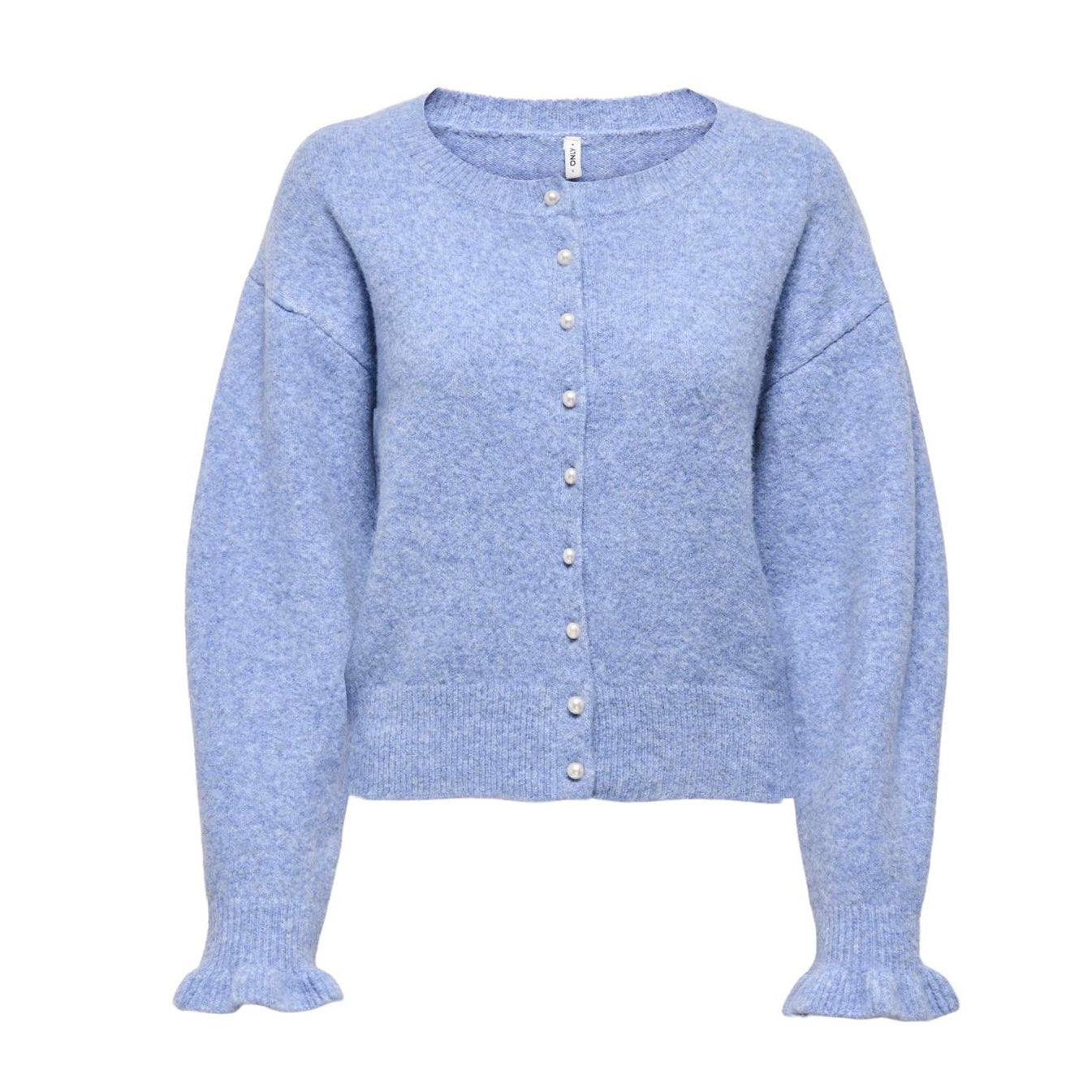Denne løstsiddende cardigan med rund hals er perfekt til både vinterdage og sene sommeraftener. Den er fremstillet i en blød flat knit-strik, der giver fleksibilitet, komfort og et rent udseende. Cardiganen har lange balloon-ærmer med flæsekant ved manchetterne og lukkes med knapper, som er pyntet med perlebesætninger for et delikat touch.