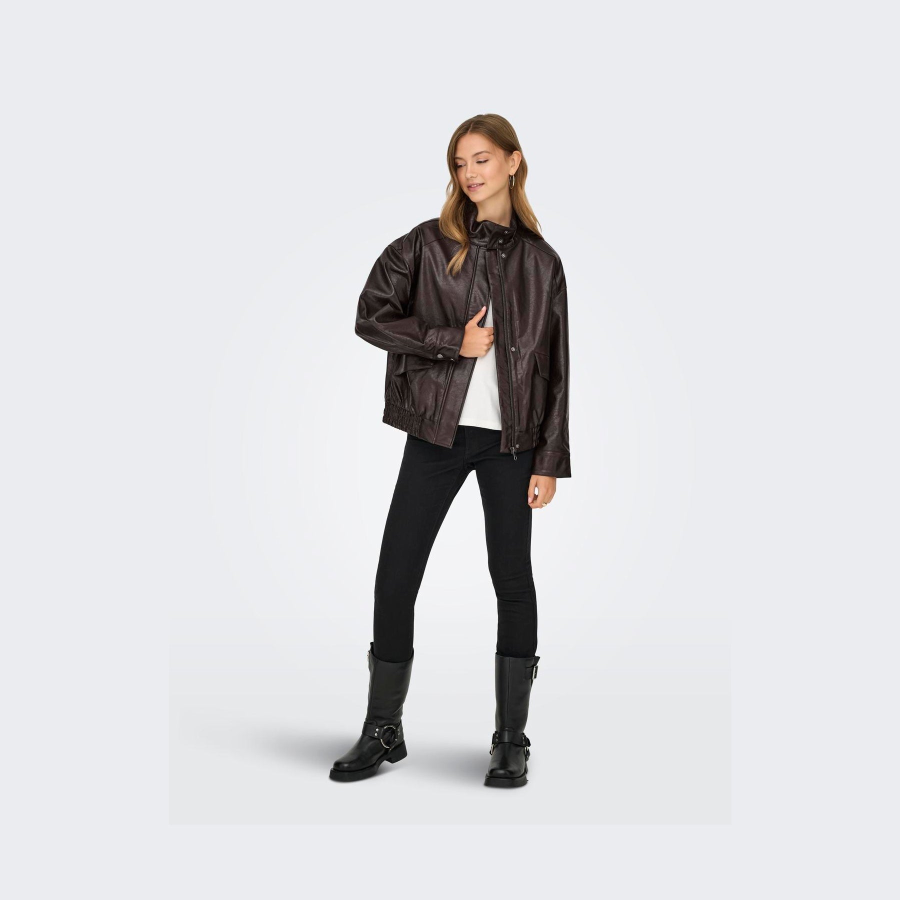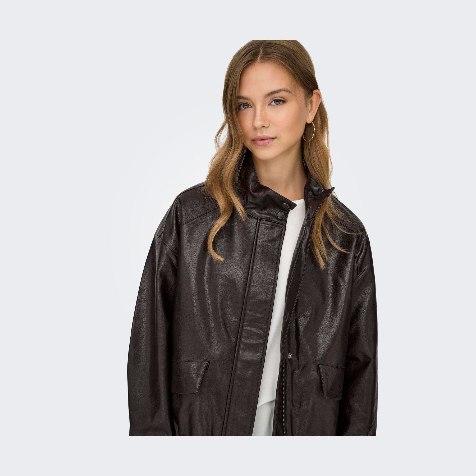 Super cool og trendy bomberjakke i den helt rigtige chokoladebrune farve. Jakken er i vegansk læder og giver dig et sejt og moderne udtryk. Brug den både inde som en blazer/cardigan eller ude som en overgangsjakke. Kan styles over kjoler, til nederdele, et par fede jeans etc.