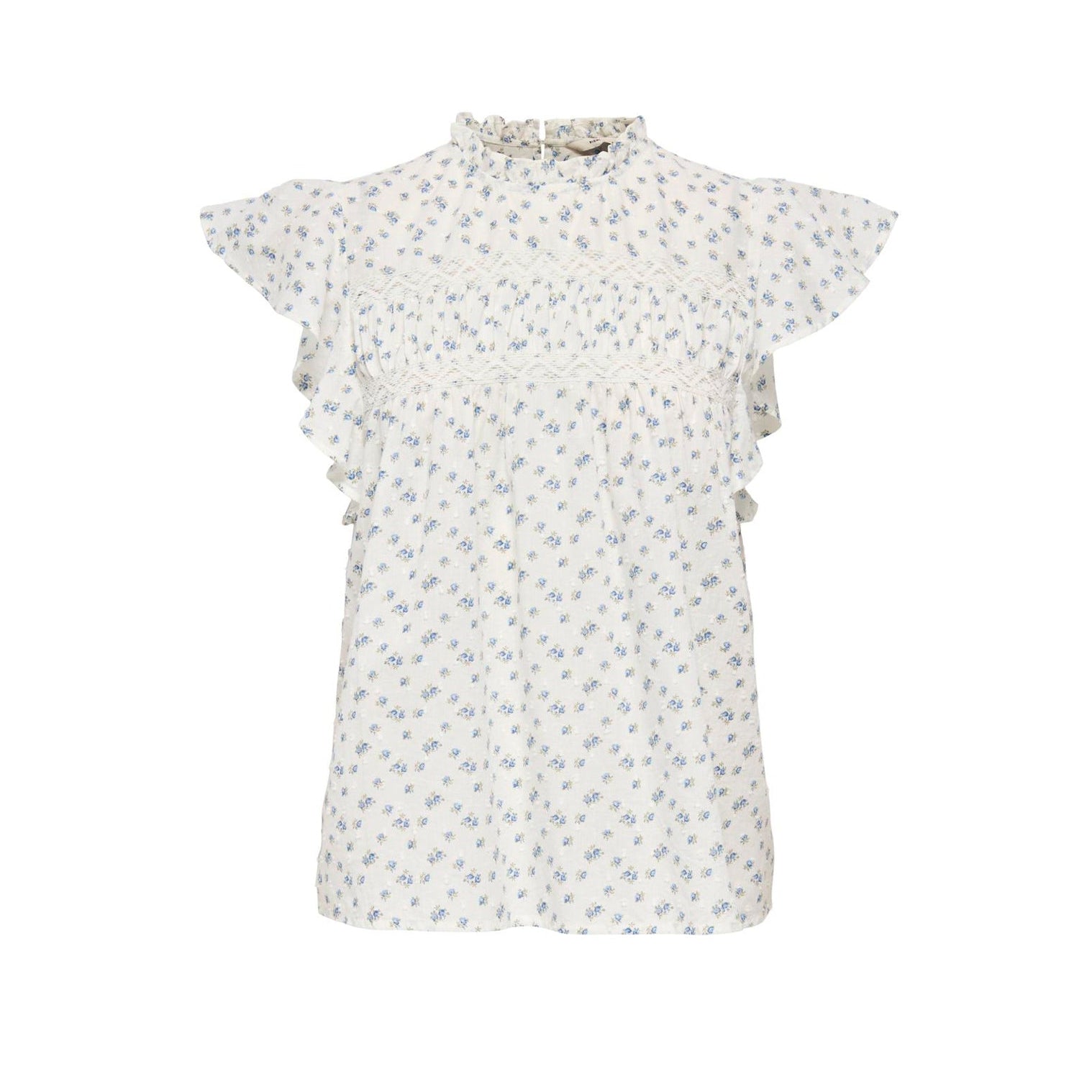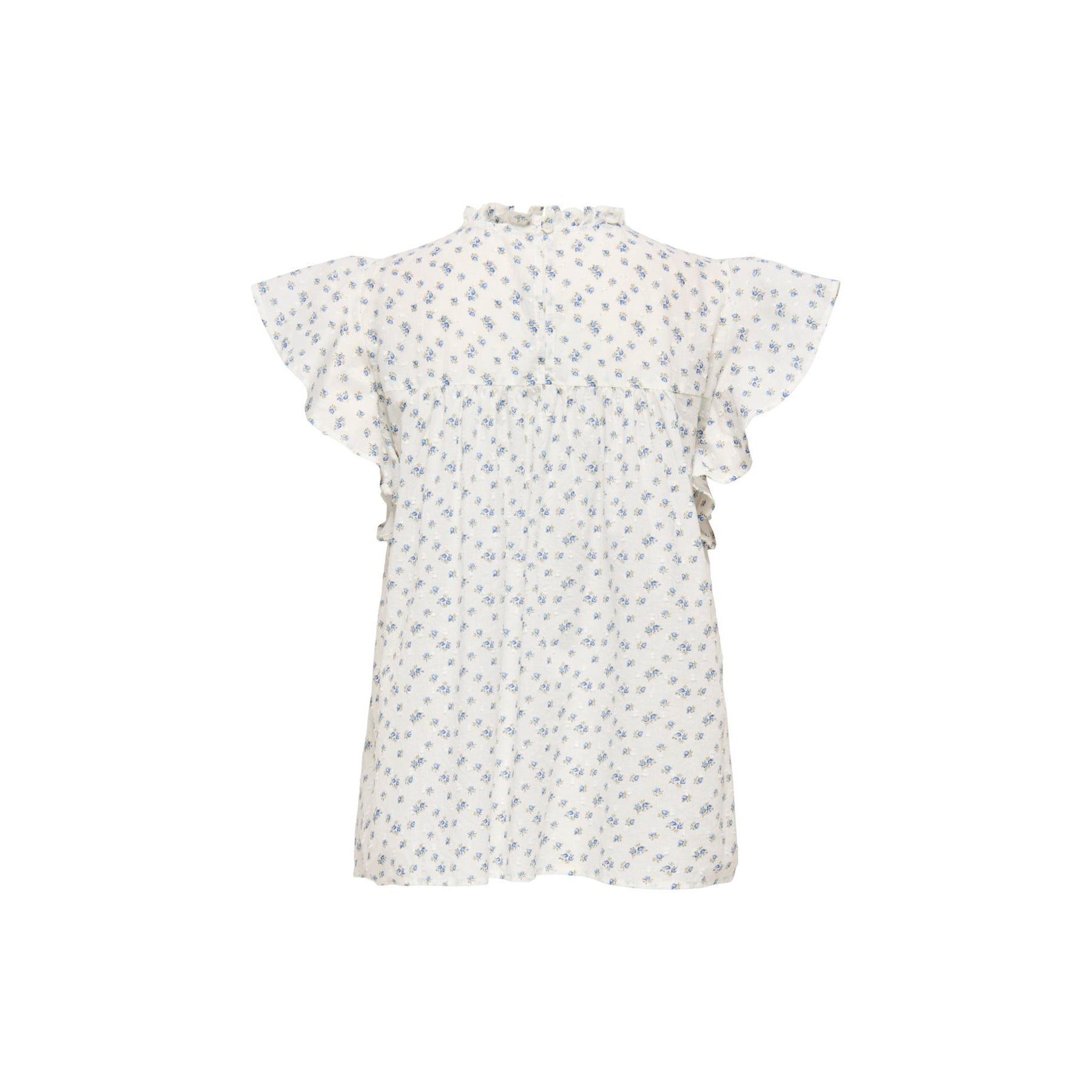 Let og luftig top i dobbeltvævet bomuld med rund hals og korte ærmer. Den har knaplukning og fine flæsedetaljer, der giver et feminint touch til et afslappet, dagligt look. Farven "Cloud dancer" med mønstret "CLARA FLOWER" fremhæver forårs- og sommerstemningen.